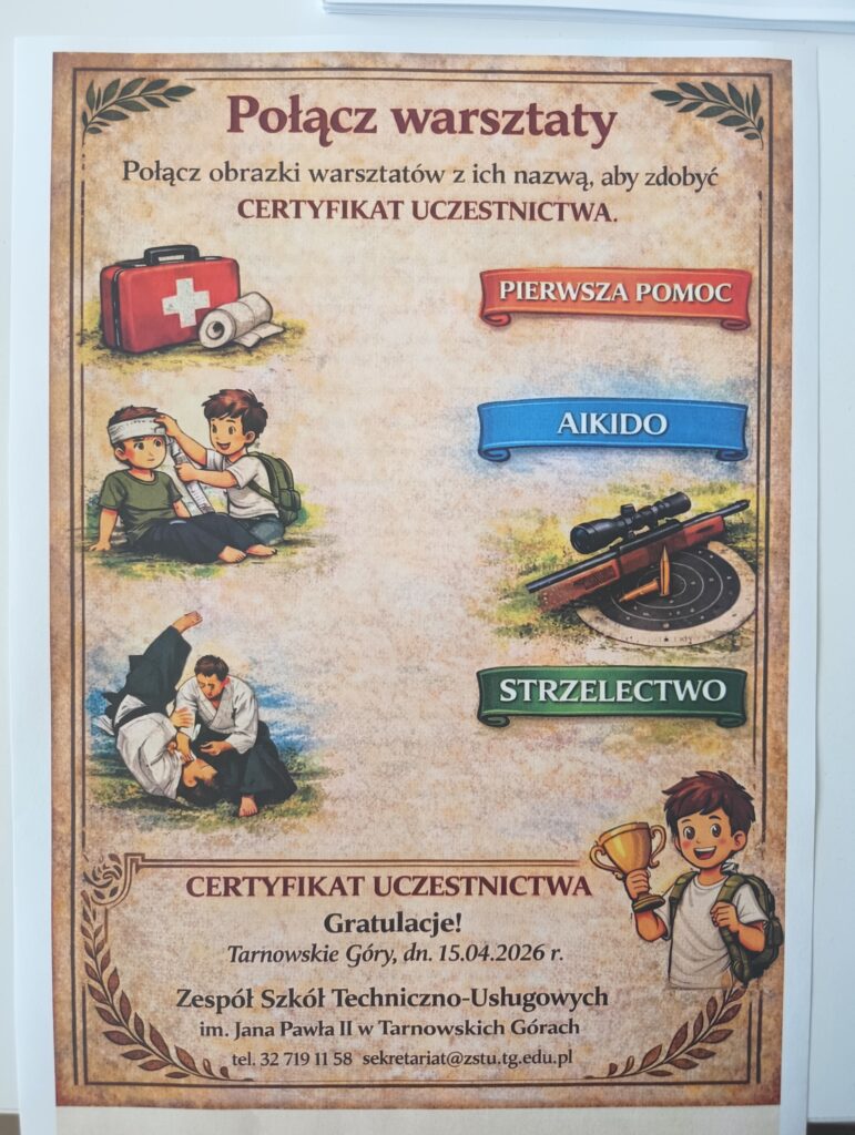 W dniu 15.04.2026 r. w naszym Zespole Szkół zostały zorganizowane warsztaty dla uczniów klas ósmych szkół podstawowych. Młodzież miała okazję poznać i aktywnie uczestniczyć w zajęciach: strzeleckich, pierwszej pomocy, samoobrony – aikido, oraz wysłuchać prelekcji o zawodzie technik logistyk. Każdy z uczniów otrzymał Certyfikat uczestnictwa.